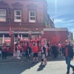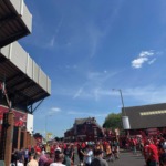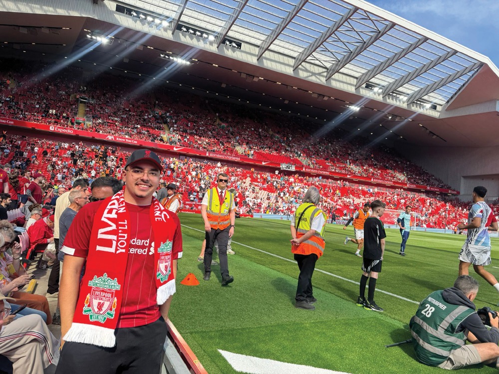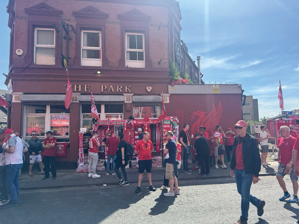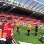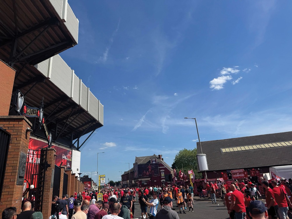 Gazonul e impecabil și înainte, și după meci, pentru că am văzut că și la pauză au intervenit acei responsabili cu starea gazonului, și la finalul partidei în mod imediat, că am mai rămas acolo la fotografii. Fiul meu, fiind foarte încîntat de toată atmosfera, atît de dinainte, cît și din timpul meciului și de după, a avut onoarea să dea mîna cu Mohamed Salah și cu Diogo Jota pe tunelul de intrare. Dacă ești lîngă tunel, se întinde mîna din tribune și prin bunăvoința jucătorilor… Era înainte de a începe meciul, după aia am mers la locurile noastre. Cînta tot stadionul. O atmosferă de mare sărbătoare, oameni foarte relaxați, mai ales cei care, efectiv, nu participă, cred că din același considerent, lipsă de abonament, lipsă de bilet, ei stau în preajma stadionului, e o atmosferă extraordinar de frumoasă. Sînt televizoare amplasate, e totul organizat, sînt terase. E o industrie, funcționează, merge ceas. Arhipline și terasele. Deci e o industrie întreagă, produc bani din absolut orice. Atît din chestiile alea, din produsele alimentare, băuturi, materiale promoționale, tot, tot.