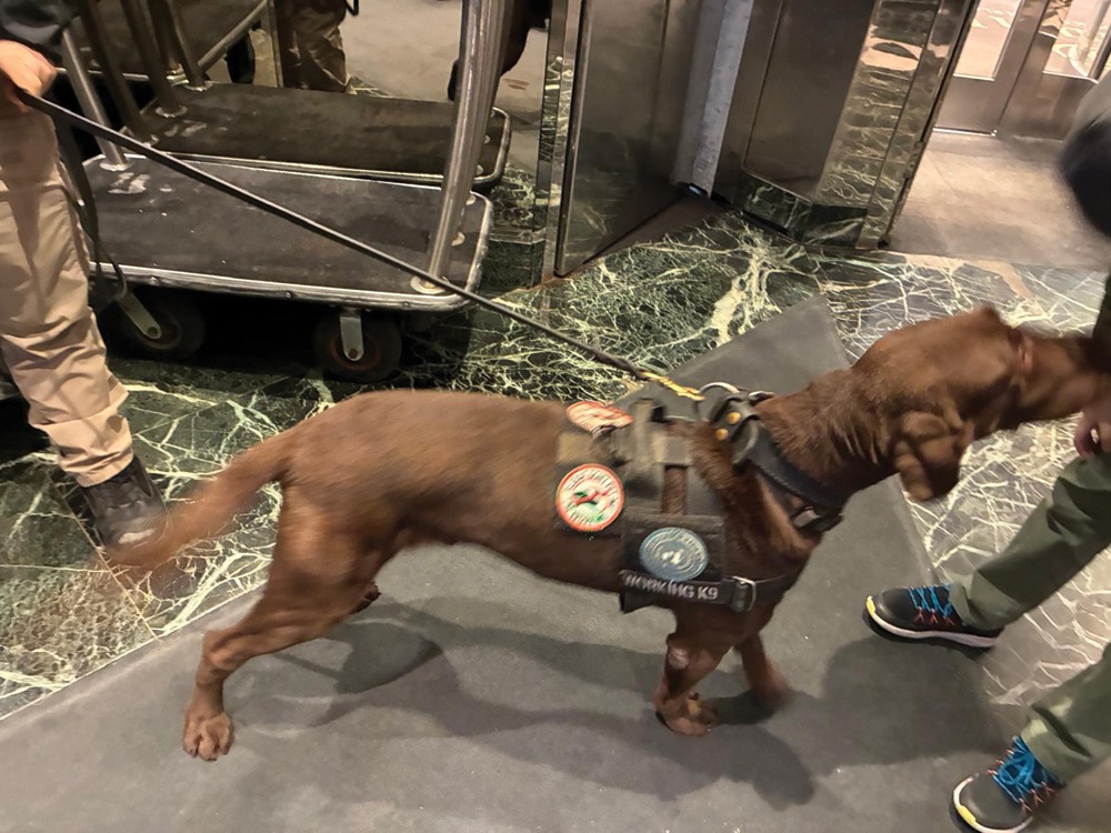 Ei sînt agenți federali înarmați. În prima zi era un tinerel, a doua zi o tinerică și a treia zi era un domn. I-am cerut permisiunea domnului respectiv să fac o fotografie cu cîinele și a zis da. El mi-a mai spus că există această intrare pentru turiști, iar la etajele I și II sînt birouri ale funcționarilor de la Națiunile Unite. Am rămas <paf>! Eu am văzut în fiecare dimineață, am văzut că se vorbeau toate limbile de pe glob acolo – erau și indieni, erau și nemți, și francezi, și chinezi, și sud-coreeni, dar să fie birouri acolo nu mi-am imaginat… Și atunci mi-am spus că are sens să fie prezenți și cîini acolo.