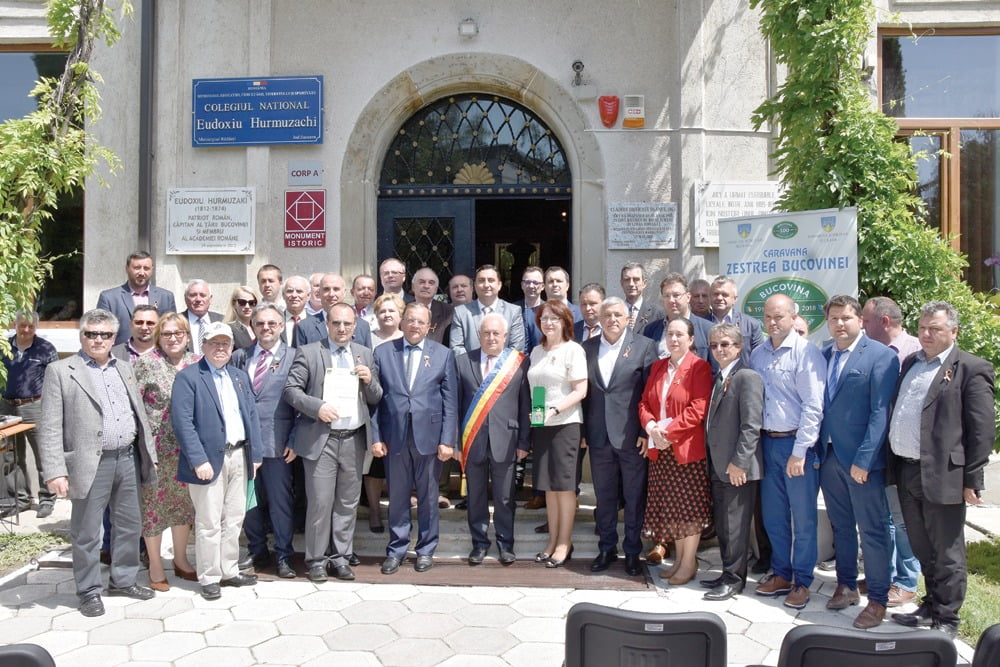 Autorităţi prezente la un eveniment dedicat Unirii, care a fost găzduit de Colegiul Naţional „Eudoxiu Hurmuzachi” Rădăuţi: „Ce noroc pe noi, autorităţile din ziua de astăzi: domnul Eudoxiu a făcut multe pentru drepturile românilor din Imperiul Habsburgic, alţii au făcut clădirea, iar nouă nu ne-a mai rămas decît să facem o poză de grup”.