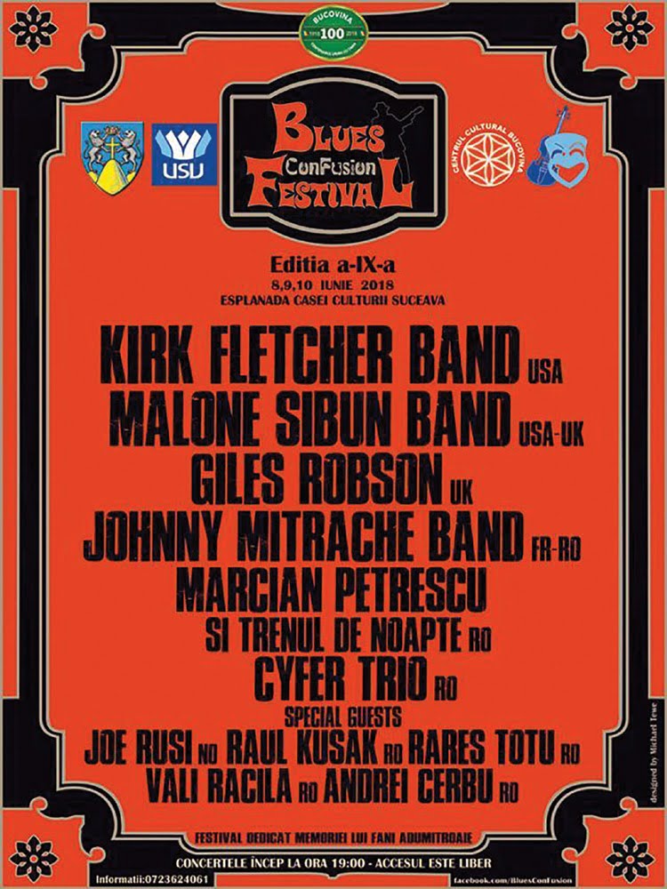 Sfîrșitul acestei săptămîni ne readuce blues-ul în suflet, în minte și… pe stradă, fiindcă ediția din acest an a Festivalului, ajuns la ediția a IX-a, se desfășoară pe parcursul a 2/3 din durata sa pe Esplanada de la Casa de Cultură, adică în serile de 8 și 9 iunie, între orele 19 și 23. Ultima seară, cea de 10 iunie, va fi cea dedicată jam session-ului, locul ales fiind tot pe acolo, adică restaurantul Oscar Wilde. Evident că în primele două seri accesul va fi liber, cele 150 de locuri din ultima seară urmînd să fie ocupate de cei care achită între 80 și 150 de lei pentru niște pachete incluzînd tricouri și între una și patru brățări de acces. Detalii în acest sens puteți obține pe suceavablues.ro. Mai trebuie spus și că fondurile obținute vor fi folosite pentru achiziționarea de instrumente muzicale și echipament de sunet care urmează a fi folosite la Centrul de Zi Blijdorp Suceava pentru meloterapie. Cît privește participarea, și ediția din acest an aduce nume mari din blues-ul mondial, precum Kirk Fletcher Band din SUA sau Giles Robson din Marea Britanie, precum și un grup anglo – american, Malone Sibun Band. România este și ea bine reprezentată de… norvegianul Joe Rusi, de francezii Johnny Mitrache Band, iar la jam nu m-ar mira să-l văd/aud și pe austriacul Marius Dobra! Deschiderea Festivalului o vor face Marcian Petrescu și Trenul de Noapte, iar pe scenă vor mai urca în cele trei zile și Cyfer Trio, Rareș Totu, Raul Kusak și buna lui prietenă, orga Hammond, precum și fostul copil-minune, Andrei Cerbu, devenit bluesman redutabil. Joe Rusi cică va cînta la keyboards, fiindcă mîna recent fracturată se mișcă mai greu pe corzi, iar Vali Răcilă vine doar dacă reușește să-și rezolve problemele de la locul de muncă. Concluzia e că Bobby Stroe iar m-a uimit cu ce nume a pus pe afiș, iar dacă la anul îl (re)aduce și pe Lance Lopez…