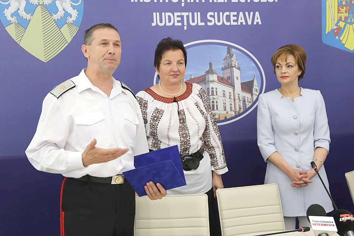 Mirela Adomnicăi şi Silvia Boliacu, emoţionate la ieşirea la pensie a comandantului Inspectoratului pentru Situaţii de Urgenţă, generalul Ioan Burlui, căruia i-au oferit o distincţie de excelenţă: „Şi am să închei cu un celebru citat al lui Napoleon: « În raniţa fiecărui general se află bastonul de pensionar »”.