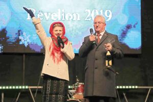 Interpreta de muzică populară Andra Matei şi primarul Ion Lungu, pe scena amenajată în parcarea „Iulius Mall”, la trecerea dintre ani. Deci, cei doi vestitori au fost, de fapt, trei: Lungu, Andra şi Matei.