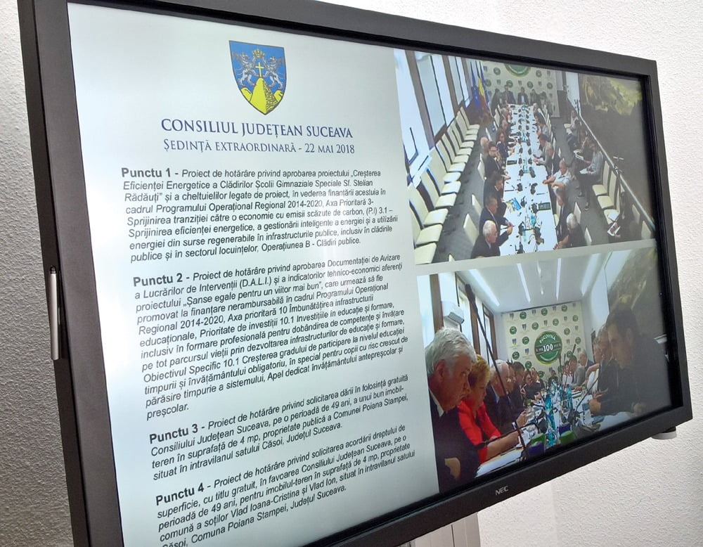 me financiare mari la Consiliul Judeţean Suceava. După ce a mărit salariile şi a cumpărat acest prea frumos monitor pentru sala de şedinţe, conducerea administraţiei judeţene nu a mai avut bani şi pentru patru de „l” şi de aceea „punctu” nu-i „punctul”.