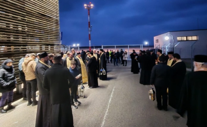 Preoți veniți la Aeroportul Internațional ”Ștefan cel Mare” din tot județul, în așteptarea Luminii Sfinte de la Ierusalim: ”Să sperăm că nu se va trezi vreun deștept să meargă cu geamul de la avion deschis, să se facă curent și să ne stingă candela”.