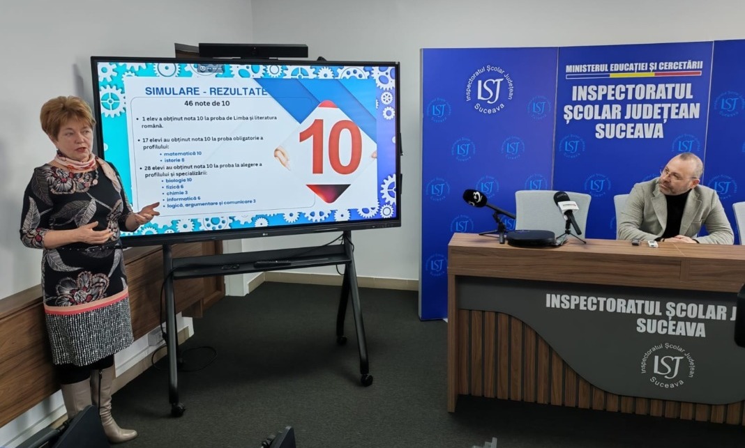 Conferință de presă cu participarea purtătoarei de cuvînt a Inspectoratului Școlar Suceava, Tatiana Vîntur, și a conducătorului instituției, Ciprian Anton: ”Din fericire, mai sînt și elevi care iau 10 la simulările Examenelor Naționale. Îi rugăm pe aceștia ca după o perioadă în care se laudă cu notele în familie și la prieteni să le aducă înapoi, ca să le putem da și altor copii”.