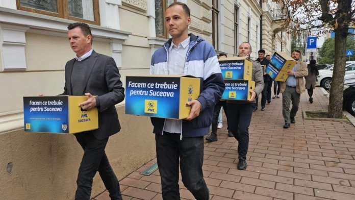 Cutiile cu semnături pentru candidații PNL Suceava la alegerile parlamentare sînt transportate la Biroul Electoral: ”Acum puteți să vă convingeți că în PNL treburile sînt foarte clar împărțite. Sarcina noastră, a liberalilor de rînd, este să ne <rupem> mîinile cărînd aceste cutii, iar șefii, săracii, își vor <rupe> spinarea cu problemele Țării care vor apăsa pe umerii lor de parlamentari”.