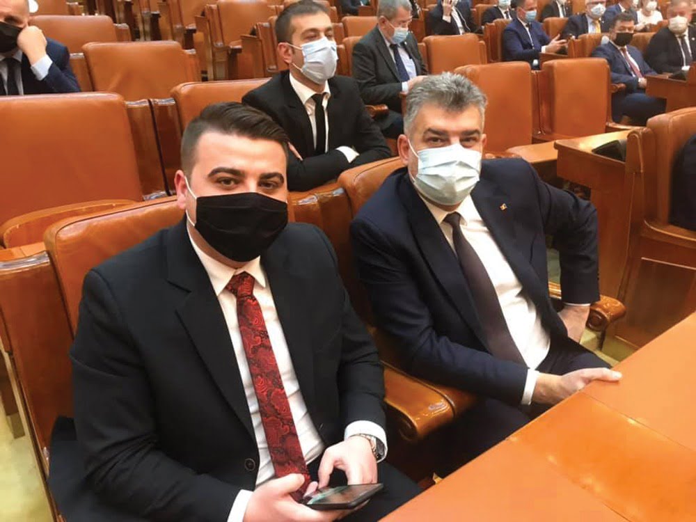 Deputatul PSD de Suceava George Șoldan și liderul partidului, Marcel Ciolacu, la o scurtă ședință foto: ”Domn președinte, să vedeți ce o să se mai mire rudele mele cînd vor vedea această fotografie de colecție. Neam de neamul meu nu a crezut că va avea așa o freză cum mi-am tras eu”.