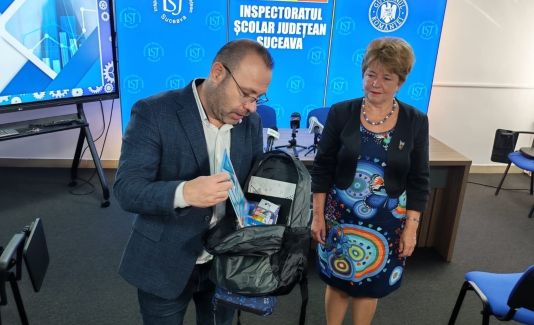 Șeful Inspectoratului Școlar Suceava, Ciprian Anton, și purtătoarea de cuvînt a instituției, Tatiana Vîntur, arătînd ce conține un ghiozdan care va ajunge la copiii din zonele sinistrate în cadrul campaniei „Fii solidar! Împreună redăm speranța!”: ”Doamna Vîntur, văd aici un caiet, niște creioane și un set de carioci, dar speranța unde-i?”.