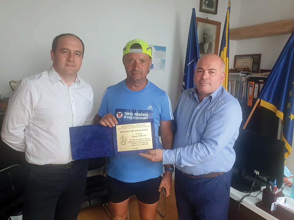 Polițistul în rezervă Dănuț Cernat, care face Turul României în alergare în vederea strîngerii de fonduri pentru copiii polițiștilor răpuși de COVID, a ajuns la Suceava, unde a primit o Diplomă de Excelență din partea prefectului Iulian Cimpoeșu și a șefului interimar al Inspectoratului Județean de Poliție, Florin Poenari: ”Felicitări, domnule Cernat, pentru efortul dumneavoastră deosebit. Să mai aud eu pe cineva că de ce ies polițiștii la pensie mai repede? La 65 de ani cui îi mai arde de alergat prin țară după diplome?”.