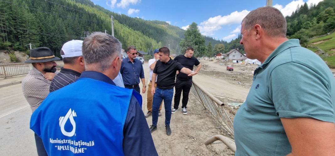 Președintele CJ Suceava, Gheorghe Șoldan, îi explică prefectului Traian Andronachi ce mai are de făcut în cadrul operațiunii de reconstrucție a Broșteniului: ”Traiane, iei balustrada asta și o cureți bine pînă scoți tot balu. Și uite că am mai făcut rost de o stradă pentru Broșteni”.