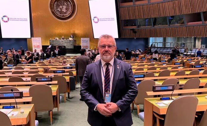 Senatorul PSD de Suceava George Mîndruță, la New York, la cea de-a XI-a Reuniune a Forumului Politic ONU la Nivel Înalt privind Dezvoltarea Durabilă – High-Level Political Forum on Sustainable Development (HLPF 2023): ”Știți, cînd eram mai tînăr și nu eram senator mă încumetam să pun rucsacul în spate și să urc pe Vîrful ONU. Acum, funcția și costumul ăsta m-au ajutat să ajung la vîrful ONU. E drept, doar în vizită”.