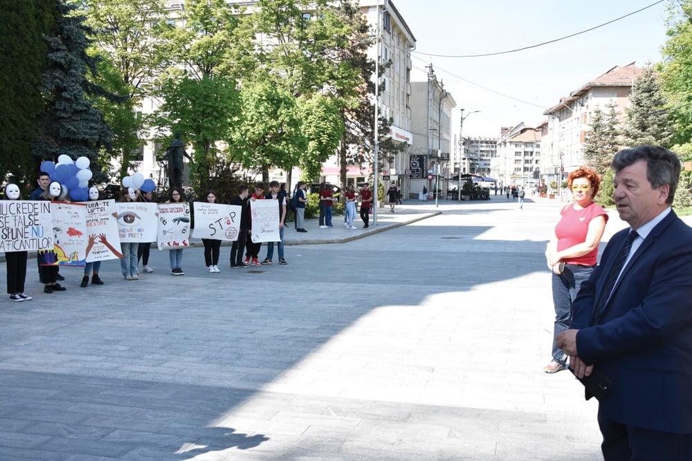 Directorul Colegiului Național de Informatică ”Spiru Haret”, Virginel Iordache, cu o parte dintre elevii școlii în fața Palatului Administrativ, la o acțiune de combatere a traficului de persoane: ”Copii, nu întîmplător am venit aici, pentru că vreau să combinăm acțiunea noastră de astăzi. Pe lîngă faptul că trebuie să luptăm împotriva traficului de persoane, este nevoie să promovăm traficul de influență, pentru că fără asta greu se va apuca cineva să repare clădirea din spatele vostru, care a fost lovită de incendiu în luna martie a anului trecut”.