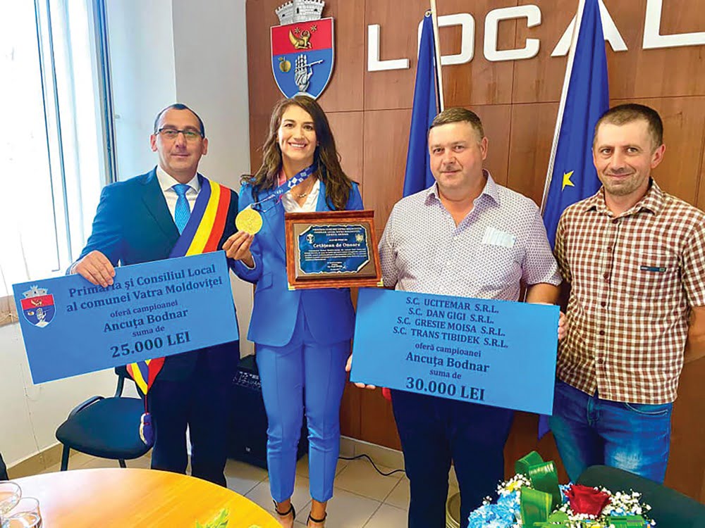 Campioana olimpică la canotaj, Ancuța Bodnar, a primit titlul de cetățean de onoare al comunei Vatra Moldoviței și 25.000 de lei din partea primarului Virgil Saghin și încă 30.000 de lei din partea unor sponsori: ”Domn primar, mulțumesc foarte mult și am o rugăminte. Spuneți-i directorului școlii să nu-i mai învețe pe copii prostii: să le spună clar, ca să știe de mici, că munca e medalie de aur, nu brățară de aur”.