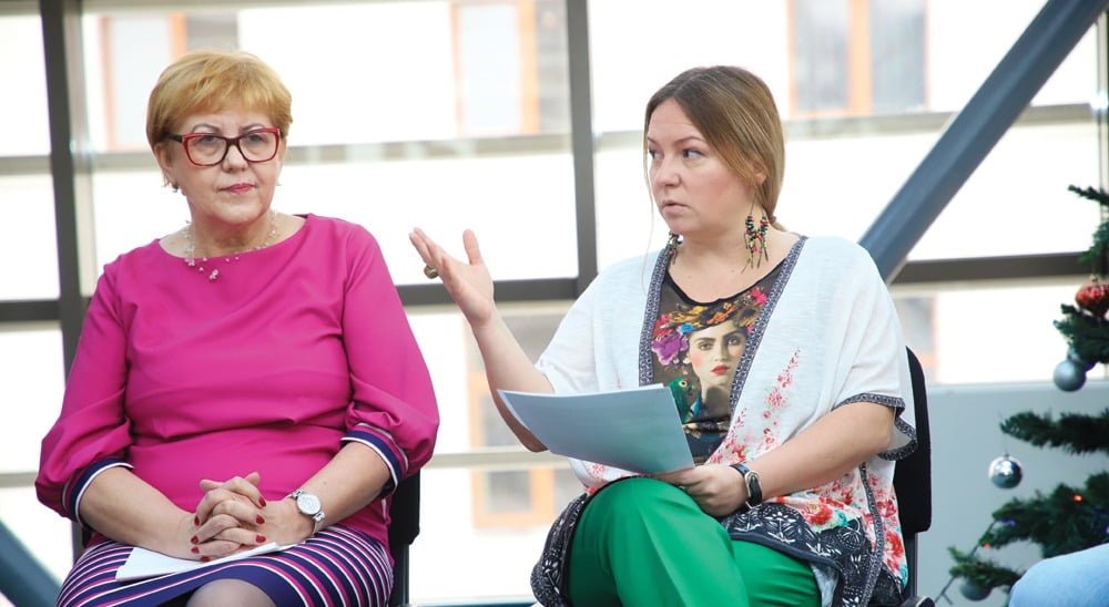 Managerul interimar al Teatrului ”Matei Vișniec”, Angela Zarojanu, și directoarea de spectacole, Alina Mihăescu, la conferința de presă de dinaintea premierei piesei ”O noapte furtunoasă”, de Ion Luca Caragiale: ”Din cauza restricțiilor impuse de pandemie ne vedem nevoiți să programăm spectacolul ceva mai devreme și de aceea am fost obligați să-i schimbăm și titlul în <O seară furtunoasă>”.