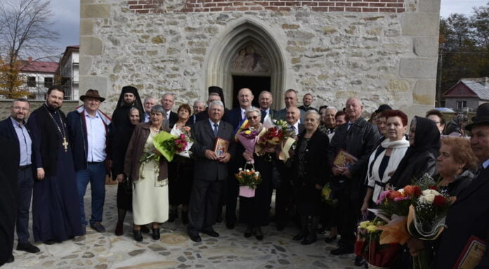 Primarul comunei Șcheia, Vasile Andriciuc, și viceprimarul, Cristinel Burac, în mijlocul celor 19 cupluri de aur pentru care s-a ținut o slujbă de mulțumire și au fost premiate și invitate la restaurant: ”Cristinel, ce noroc pe capul nostru să avem atîtea familii de oameni serioși, pentru că mai avem și noi cu ce ieși în lume. Și ce bine că m-am gîndit să facem acum această serbare, pentru că dacă ar fi fost iarna nu ne-am fi văzut în poză din cauza căciulilor de miel sau de astrahan”.