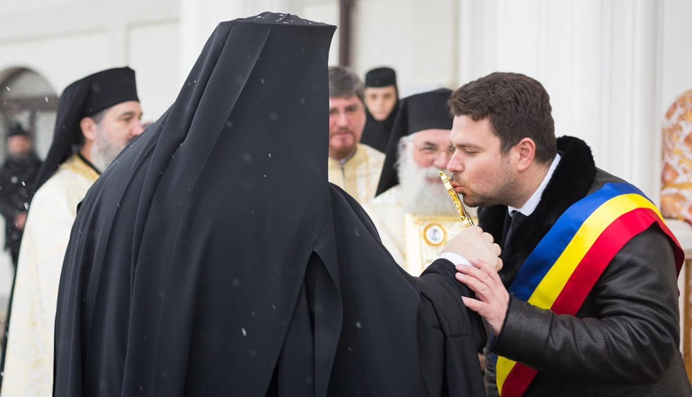 Primarul Rădăuților, Bogdan Loghin, pupînd crucea pe care i-a întins-o ÎPS Calinic, care a condus soborul de stareți, preoți și diaconi care a oficiat slujba de la Mănăstirea „Intrarea Maicii Domnului în biserică”: ”Domn primar, țineți buzele normal, că doar nu ați venit la biserică să vă faceți selfie”.