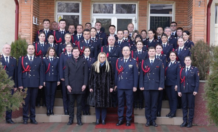 Fotografia de grup de finalul ședinței de bilanț pentru anul trecut a Inspectoratului pentru Situații de Urgență ”Bucovina” Suceava: ”Poate vă surprinde faptul că toți avem șnururi la piept, iar dumneavoastră, nefamiliarizați cu pompieria, v-ați gîndit că o sä avem lanțuri, mai ales că a fost vorba despre ședința de bilanț”.