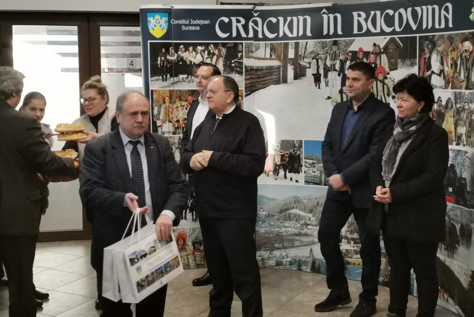 Niculai Barbă, manevrînd plasele cu mici atenții pentru cei care vin cu colinda la Consiliul Județean: ”Nu știu cum se face, dar iarăși mi-a venit mie rîndul să împart cadourile. Așa îmi trebuie dacă am fost un elev bun și mai știu și în ziua de astăzi pe de rost tabla împărțirii”.
