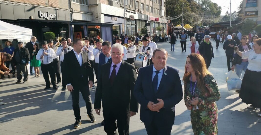 Gheorghe Flutur și Ion Lungu, aduși cu fanfara la deschiderea Tîrgului de Toamnă ”Produs în Bucovina”: ”Domnișoara, vă ascult cu cea mai mare plăcere, dar lăsați-mă acum să mă bucur de sunetul alămurilor. Sunetul ăsta îmi aduce aminte de anii studenției, de Alama Mater”.