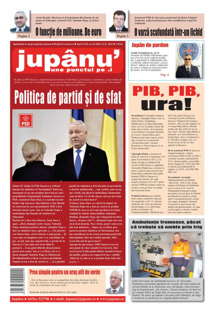 Prima pagină Jupanu – anul XVIII, nr. 02 (882) 15.01-21.01.2019 De către Jupanu - 16 ianuarie 2019 FacebookTwitterPinterestWhatsApp Jupanu – anul XVIII, nr. 02 (882) 15.01-21.01.2019