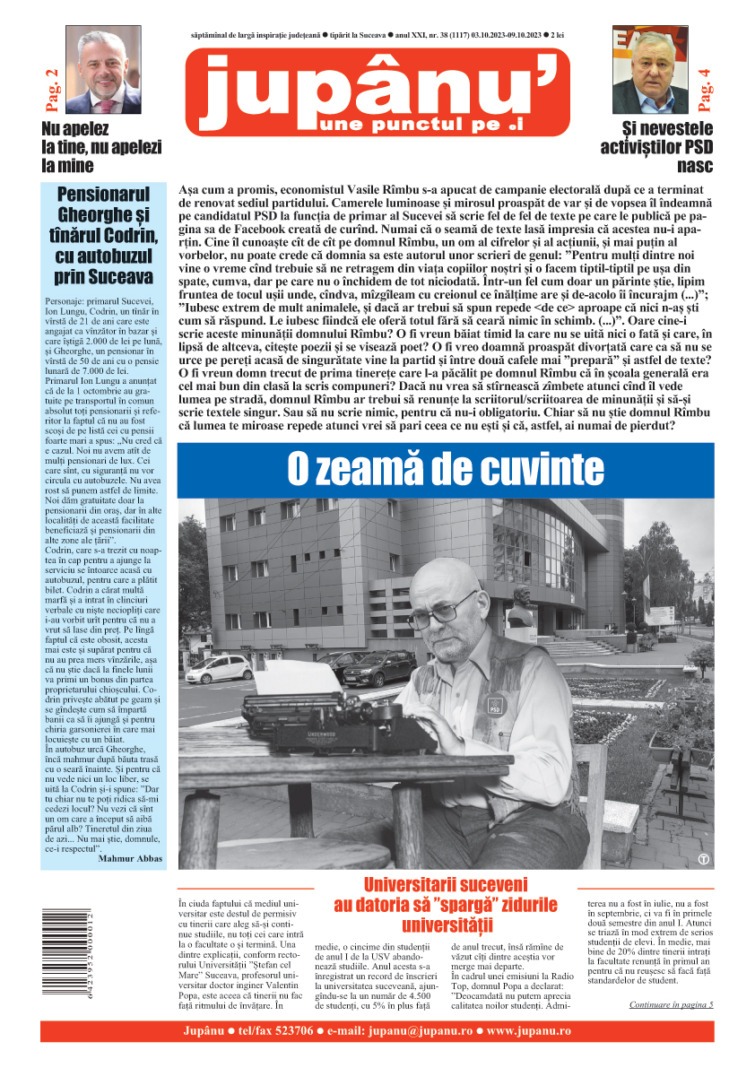 Prima pagină JUPÂNU’ – anul XXI, nr. 38 (1117) 03.08.2023 – 09.10.2023 De către Jupanu - 3 octombrie 2023 FacebookTwitterPinterestWhatsApp