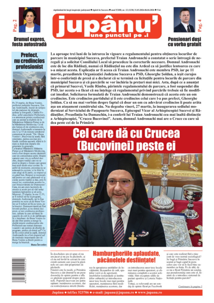 Prima pagină JUPÂNU’ – anul XXIII, nr. 12 (1237) 31.03.2026 – 06.04.2026 De către Jupanu - 30 martie 2026 FacebookTwitterPinterestWhatsApp