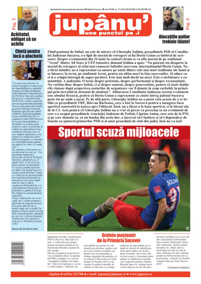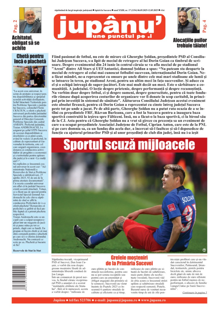 Prima pagină JUPÂNU’ – anul XXIII, nr. 17 (1194) 06.05.2025 – 12.05.2025 De către Jupanu - 6 mai 2025 FacebookTwitterPinterestWhatsApp