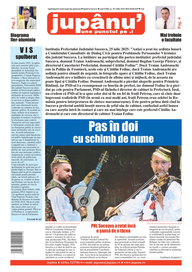 Prima pagină JUPÂNU’ – anul XXIII, nr. 29 (1206) 29.07.2025 – 04.08.2025 De către Jupanu - 29 iulie 2025 FacebookTwitterPinterestWhatsApp