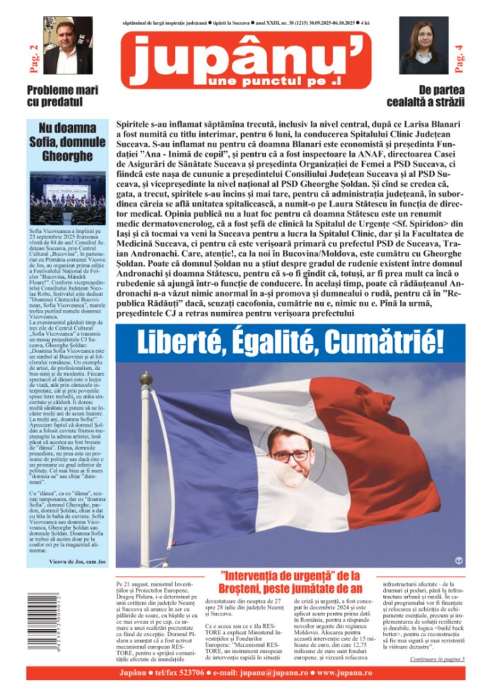 Prima pagină JUPÂNU’ – anul XXIII, nr. 38 (1214) 30.09.2025 – 06.10.2025 De către Jupanu - 30 septembrie 2025 FacebookTwitterPinterestWhatsApp