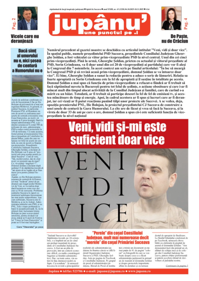 Prima pagină JUPÂNU’ – anul XXIII, nr. 43 (1219) 04.11.2025 – 10.11.2025 De către Jupanu - 4 noiembrie 2025 FacebookTwitterPinterestWhatsApp