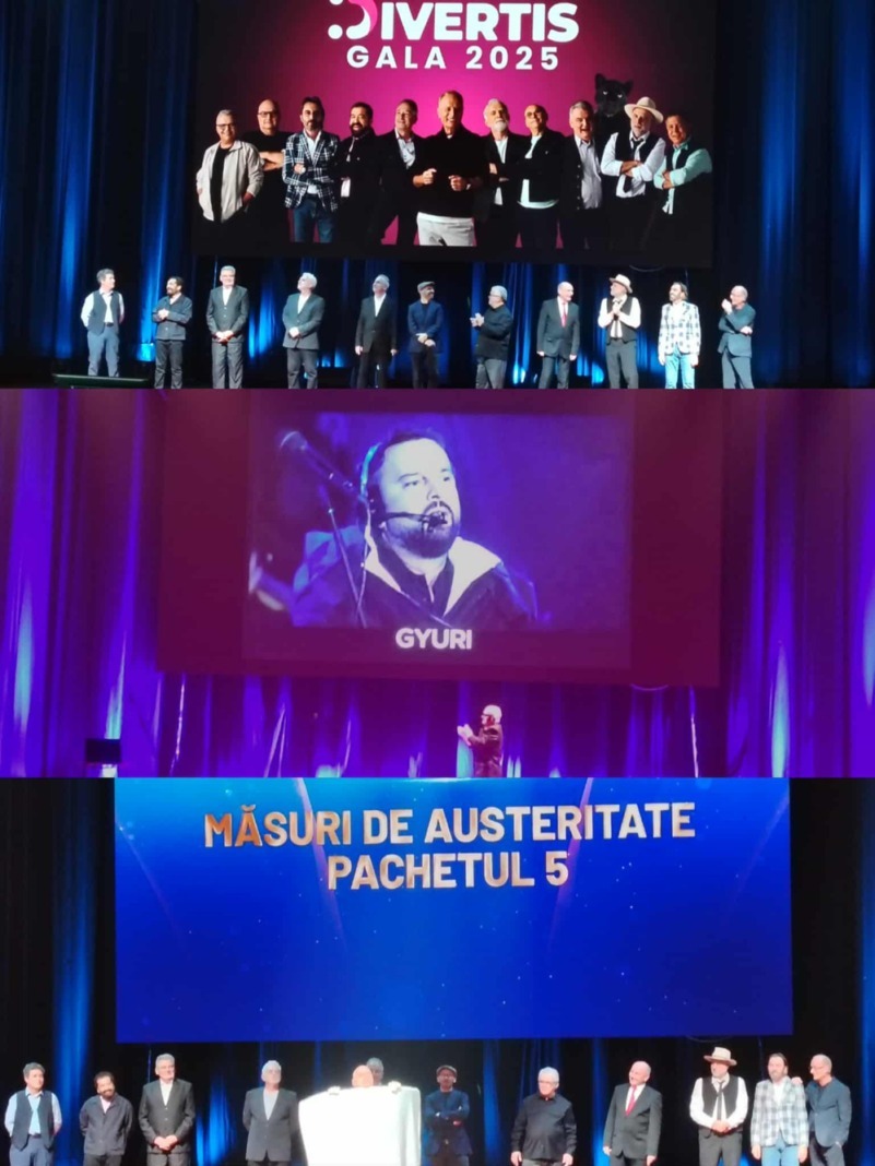 P.S.: Grupul a lansat, în cadrul acestui turneu, și mult așteptatul Dicționar de Umor DIVERTIS, care recapitulează propriile creații lingvistice (vezi zăpămînt de țîțeu, plăcinta foale-n brîu, zvonerul și răspîndacul sau espadrila de vînătoare…), dar adaugă și termeni ai altor creatori de umor sau împrumutați din filonul inepuizabil al limbii române. Găsiți Dicționarul la Editura Litera. Îmi mulțumiți după! (Foto: Sala Palatului, 19 noiembrie 2025)